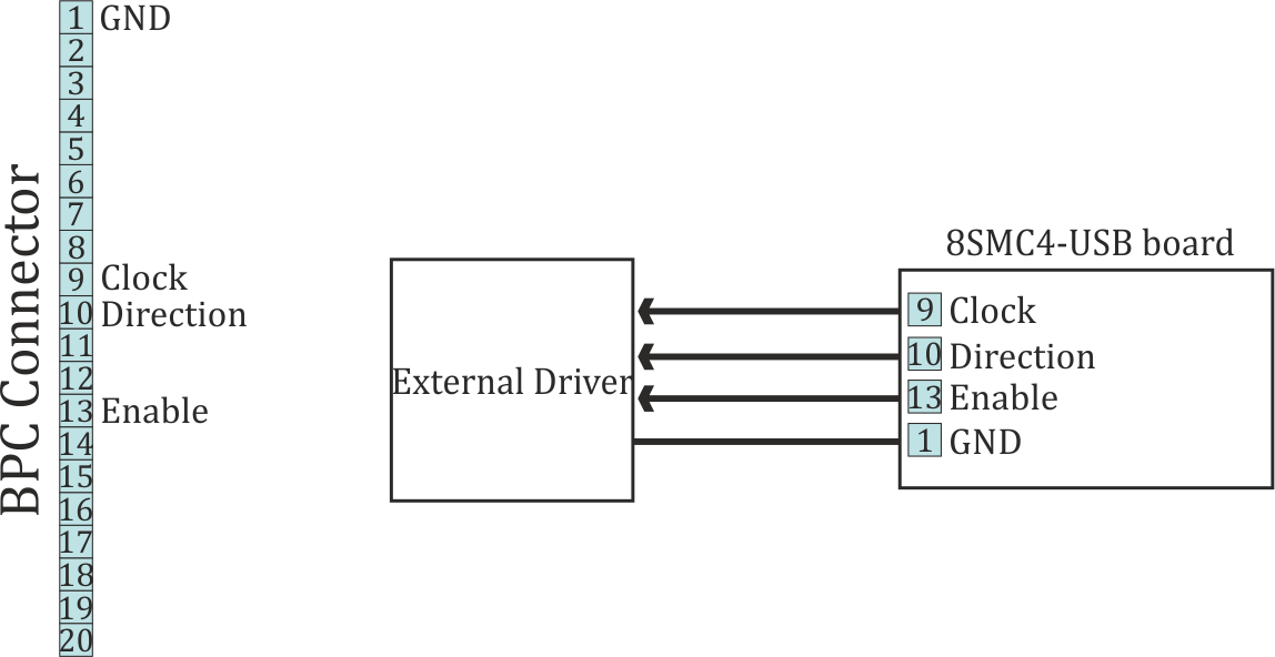 For external driver connection three outputs in BPC connector are used.