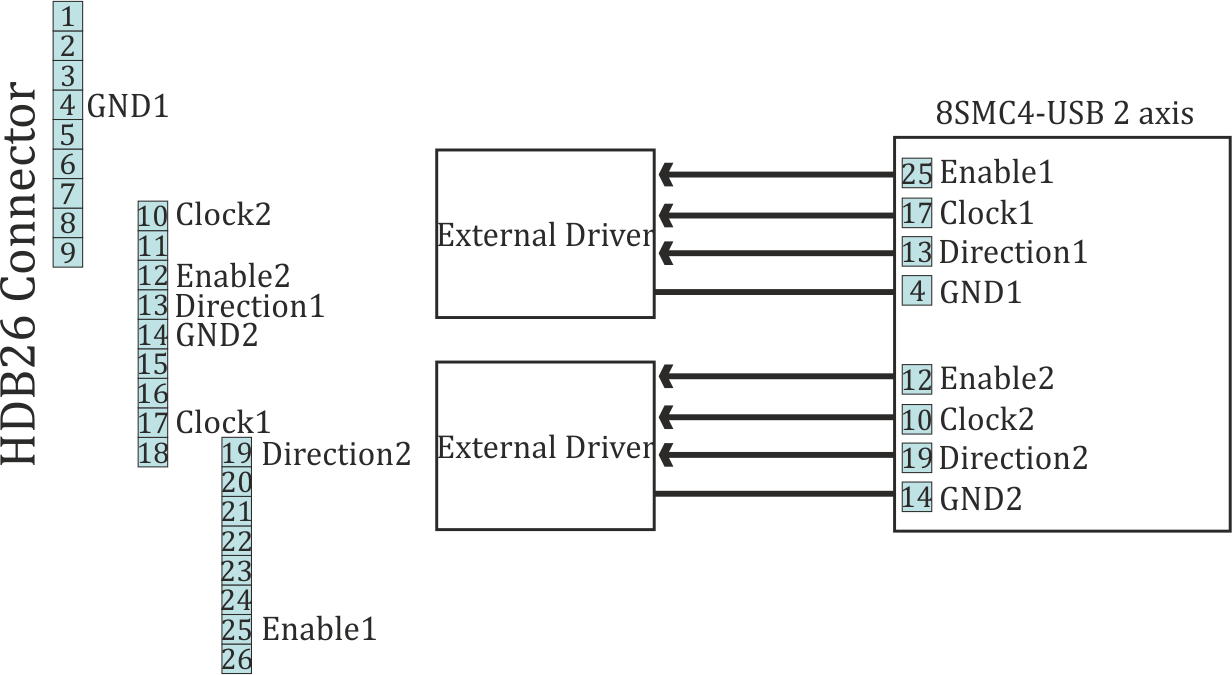 Only two-axis system has the external driver interface. It outputs on the HDB-26 connector.