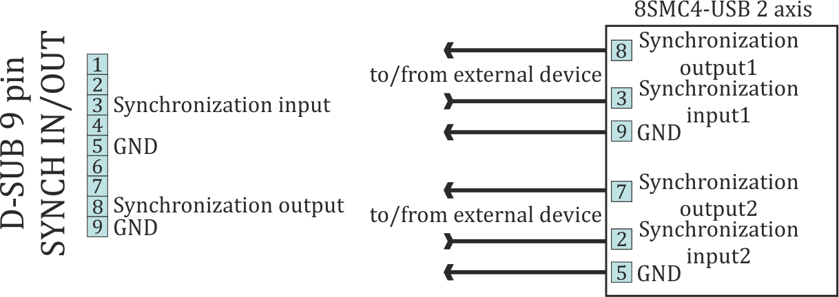 Synchronization in important in multiaxis systems because it allows one to start movement on several axes simultaneously. To do this all axes are prepared to start the movement, all slave axes are set to start moving on input synchronization pulse, one master axis is set to output a synchronization pulse on the start of the movement. Master axis output is connected to slave axes’ input. In this setup any movement of the master axis leads to immediate response of all connected axes.