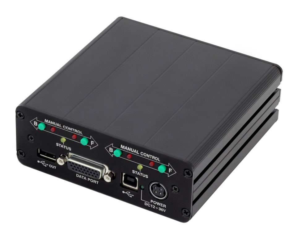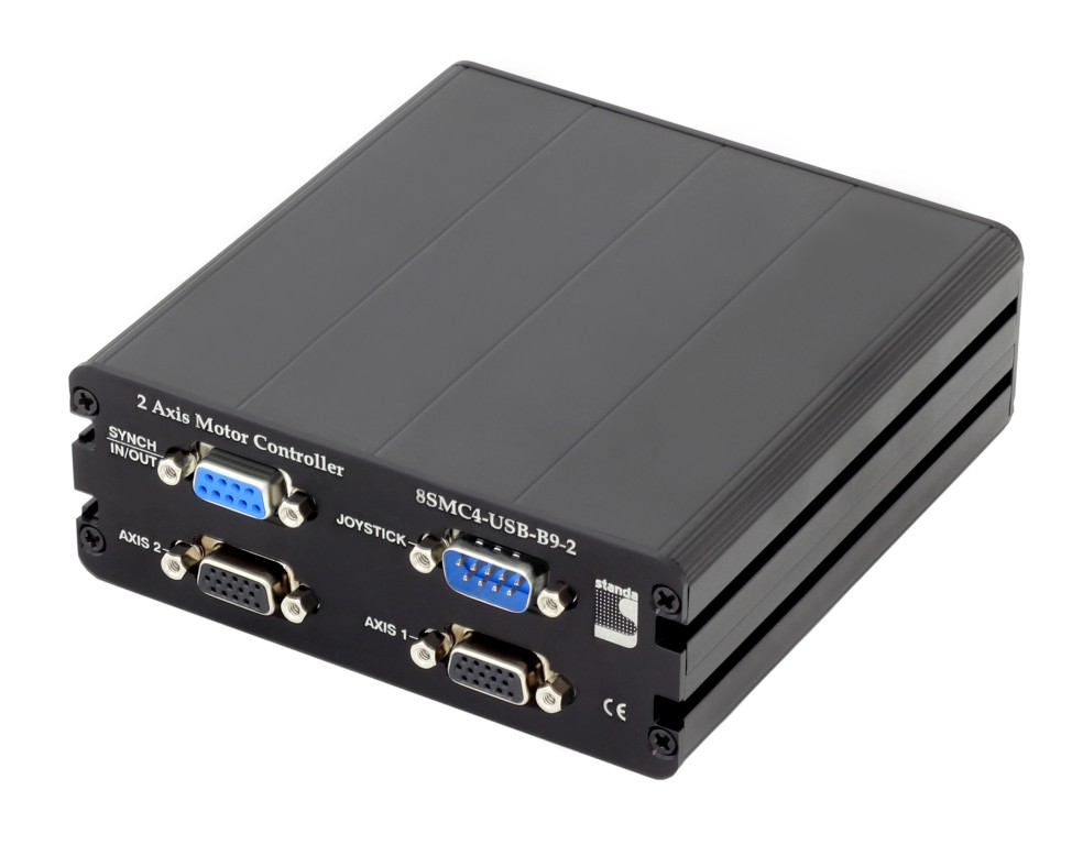Two-axis controller model consists of two controller boards in a metal case. Case dimensions are 122 x 48.5 x 124 mm. Front panel contains power supply connector, USB-B data connector, supplementary two-axis system connector, USB cascade connector, and power LED. The cascade USB-A output connector is used to connect several two-axis cases in line terminated with either one-axis or two-axis case. This way a required number of axes can be connected to the computer with a single USB cable. The front panel also contains status LED, left and right limit switch LED, left and right movement buttons for each of the two controller boards of the two-axis system. Rear panel contains positioner connector for each of the two controller boards, a synchronization connector and a joystick connector.