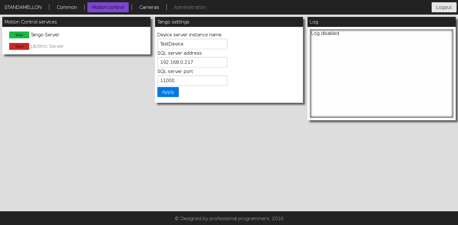 This section is dedicated to motion control services supported by the device. “Motion Control services” panel contains a list of all currently available motion control services. Clicking on services’ title opens an appropriate settings panel (or none if service has no alterable settings). Clicking “Apply” button in settings panel will persist settings in database and restart corresponding service.