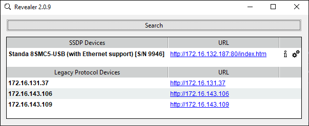 The Graphical User Interface of the “Revealer” is a simple one. In order to start search click Search button - the scan takes approximately 3 seconds. After that all Standa 8Eth1 devices found in your local network will be listed on Legacy Protocol Devices panel as clickable links. When clicked, the link opens your defaul system browser and redirects it to Administartion interface web page.