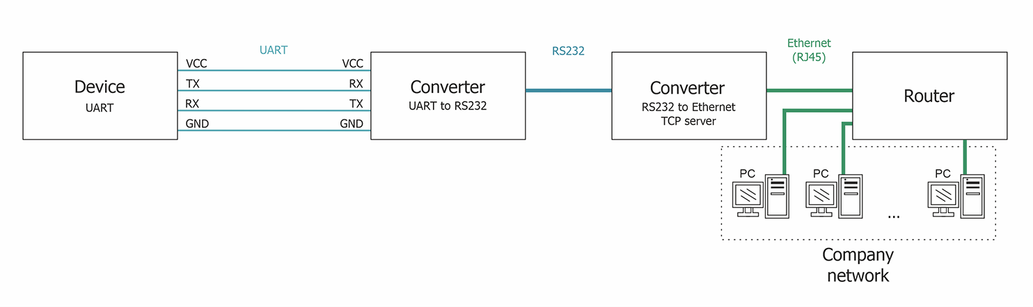 Sometimes there is a need to control the device via the serial port, and it is not always convenient to place the computer next to the device, and sometimes it is simply impossible. And then various Serial to Ethernet converters come to the rescue. Serial to Ethernet converters is designed so that devices having a serial connection type, when connected to it, are converted into network and are open for access from anywhere on the network. In addition, the function of multi-user access to a single device appears.