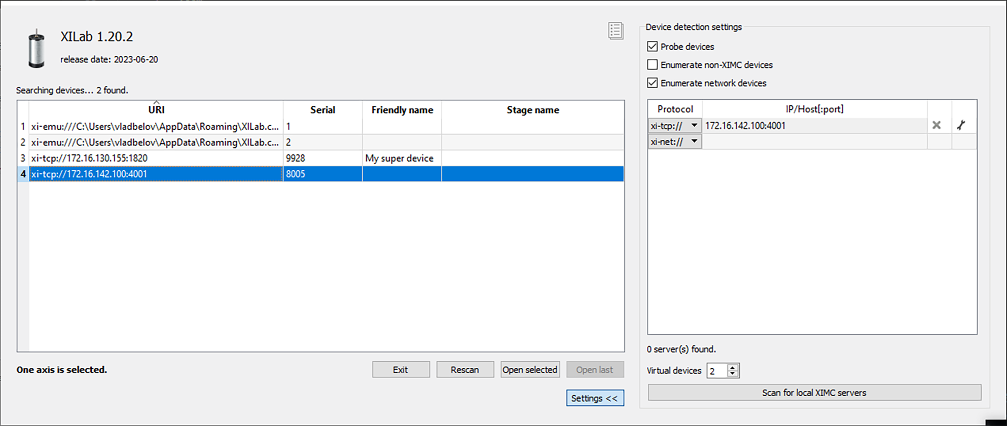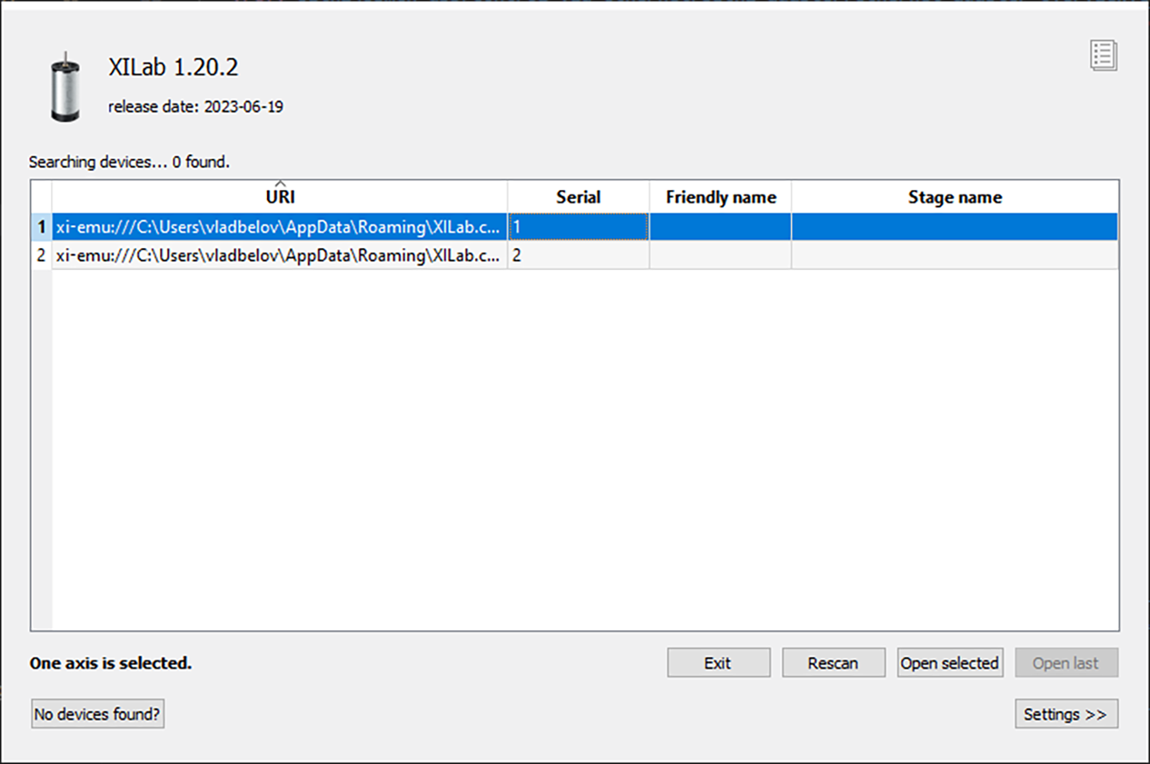 In controller detection window choose an axis you need. You can control it in single-axis mode or in multi-axis mode if more than one axis was chosen. For additional information please refer to Getting started with XILab software and XILab application User’s guide.