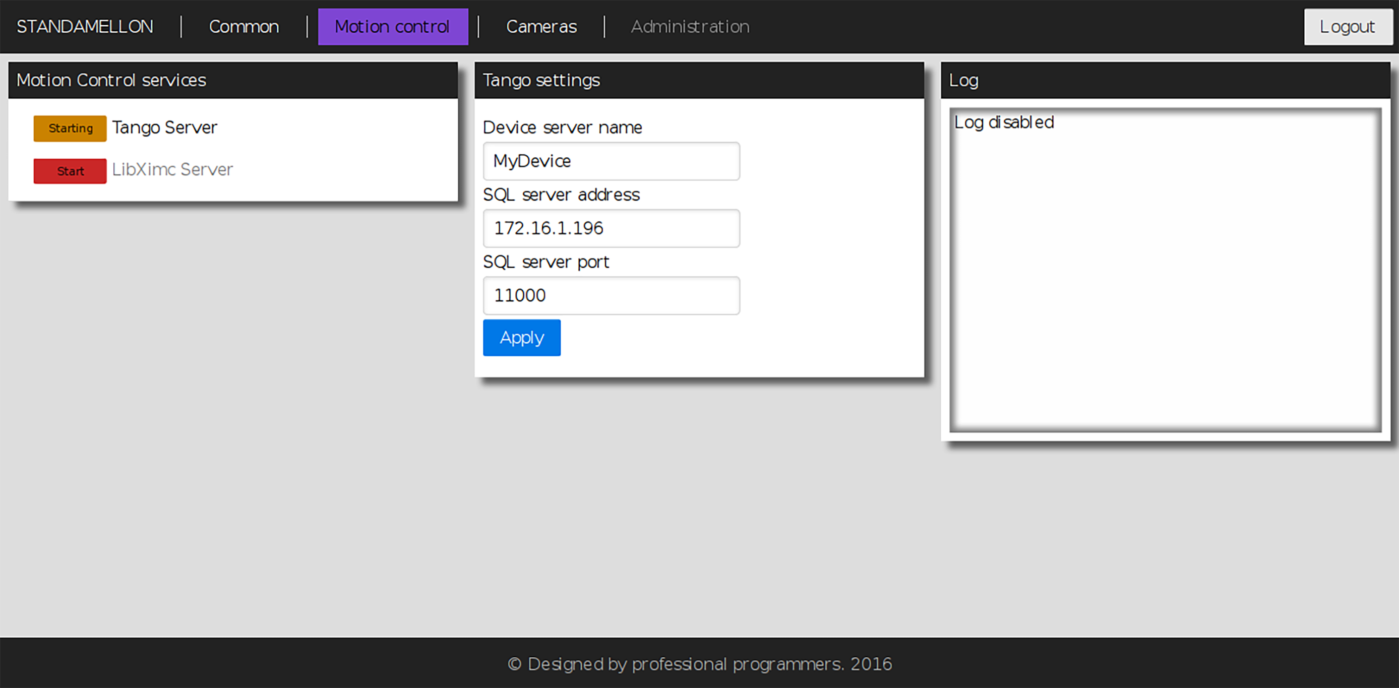 After that any exported controller is available for configuration and control through TANGO interface making it blend seamlessly with your existing infrastructure! For more info please refer to official TANGO documentation.
