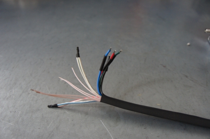 Провода от мотора и энкодера, собранные при помощи термоусадочной трубки. Обратите внимание на наличие термоусадочных трубок малого размера на проводах, идущих к обмоткам мотора (BLK, GRN, RED и BLU), а также на соединённые вместе двухцветные провода (BLK/WHT и GRN/WHT, RED/WHT и BLU/WHT). Тоненькие проводки - это контакты энкодера. Их 5 штук.