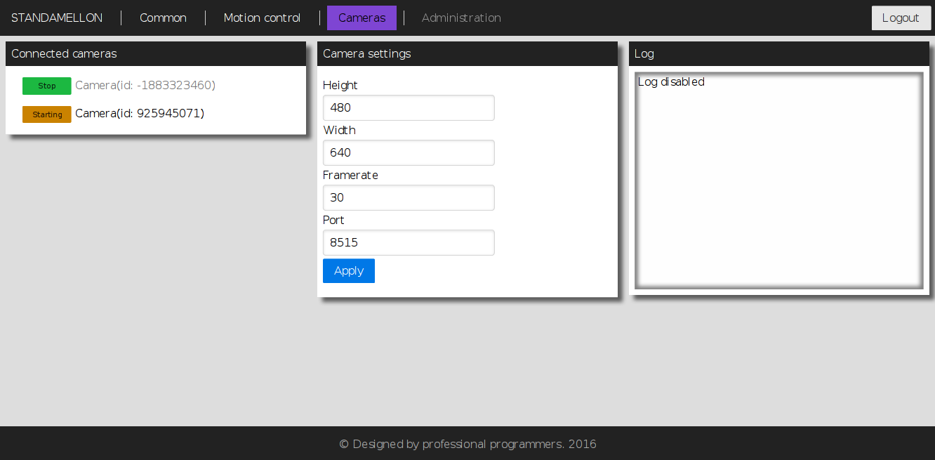 Эта секция целиком посвящяна поддерживаемым устройством сервисов управления движением. Панель «Motion Control services» содержит список всех доступных в данный момент сервисов управления движением. Нажатие на название какого-либо сервиса откроет соответсутвующую панель конфигурации (если сервис имеет какие-либо изменяемы настройки). Нажатие на кнопку «Apply» в панели настроек приведёт к сохранению настроек и полному перезапуску сервиса.