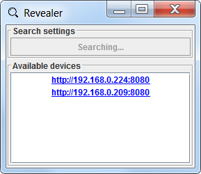 Графический пользовательский интефрейс утилиты «Revealer» очень прост в использовании. Нажатие на кнопку Search (или Restart) на панели Search settings запустит сканирование локальной сети, которые занимает приблизительно 3 секунды. В результате сканирования на панель Available devices будет выведен интерактивный список всех обнаруженных в вашей локальной сети устройств Standa 8SMC4-USB-Eth1. Нажатие на какую-либо ссылку в этом списке приведёт к открытию нового окна (или вкладки) вашего стандратного системного браузера со страницей веб-интерфейса Администрирования соответствующего устройства.