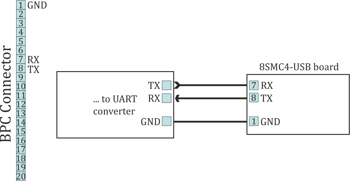 В плате контроллера выводы UART расположены на разъеме BPC.