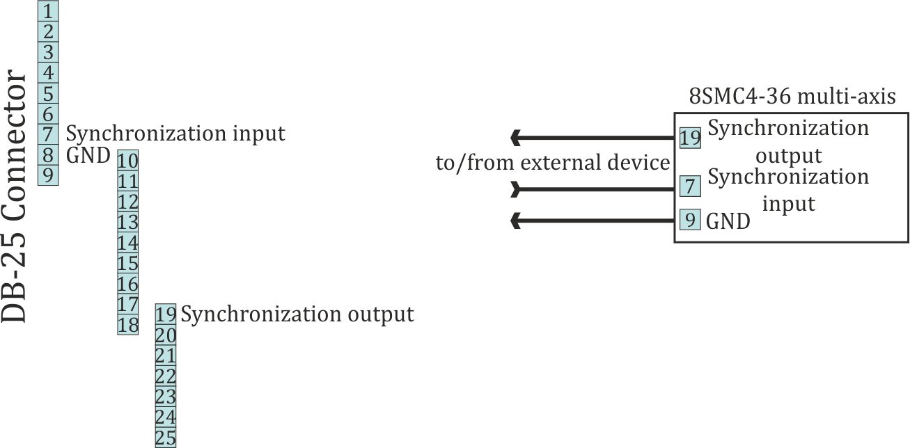 Сигналы синхронизации на многоосной системе выведены на разъём DB-25 и относятся к модулю, состоящему из 4 контроллеров. Каждому модулю соответствует 2 разъёма DB-25, причём контакты синхронизации в них дублируются.