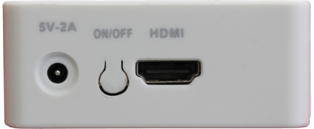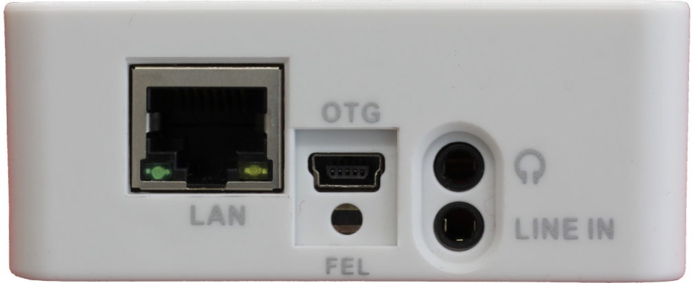Вид адаптера сзади. Слева направо: Ethernet разъём, mini-USB типа B, кнопка перехода в режим FEL, аналоговые вход/выход для микрофона и наушников
